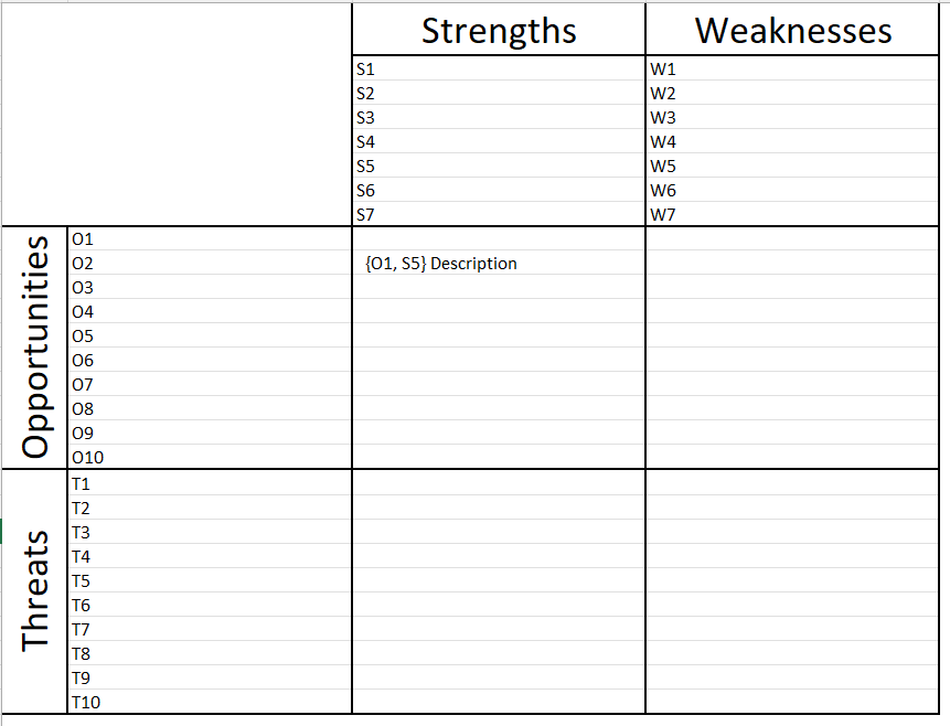 So what do we really want to get out of a SWOT analysis? We want STRATEGIC ALTERNATIVES! In other words, we want to generate a list of possible ideas to use internal and external factors to our advantage. By modifying the above template, we can get a much more useable matrix.