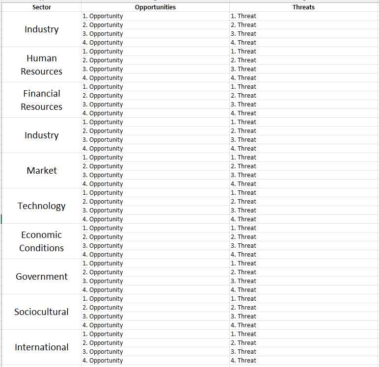 - Opportunities/Threats – This refers to the opportunities and threats common across all players in your industry. For example: “Projected nationwide shortage in wheat crops” is an industry threat whereas “Inability to purchase wheat crops in quantity” is a unique company’s weakness.