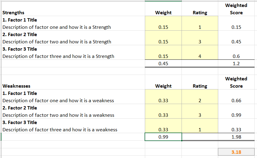 Using each of these categories, we generate an IFE and EFE matrix. The difference between the above and the IFE/EFE matrix is the latter is weighted. First, copy the environment matrix data into the IFE/EFE template. Next, assign a weight to each factor (e.g. how much should this really affect us or the industry). Finally, assign a rating (1 to 4) to each factor; 1 being the worse, 4 the best.