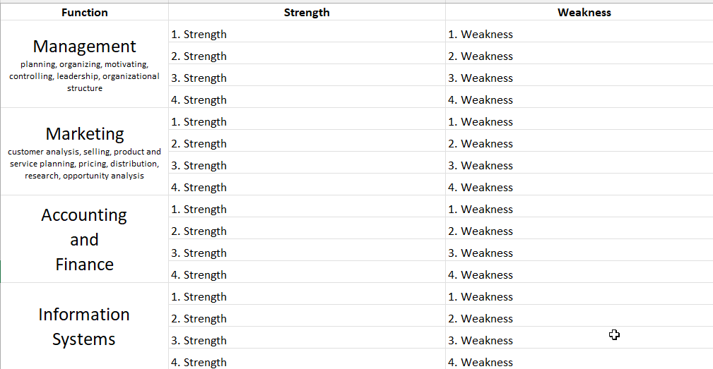 - Strength/Weaknesses – This refers to the strengths and weaknesses unique within in your own organization. For example: “Lack of Talent” would be a weakness. However, “A weakening economy” would NOT be a weakness as it affects everyone, not just your organization.
